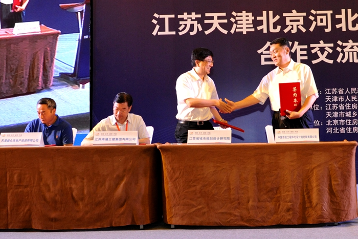 6月18日,“江蘇·天津·北京·河北四省市建設領域合作交流推進會”在天津市召開。會上,江蘇省副省長張雷、天津市副市長尹海林分別致辭;江蘇省住房城鄉建設廳廳長周嵐、天津市城鄉建設委員會主任竇華港、北京市住房城鄉建設委員會副主任王承軍先后發言;江蘇省住房城鄉建設廳黨組書記、副廳長顧小平,以及京、津、冀四省市建設主管部門領導簽署合作推進倡議書。