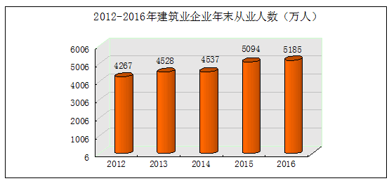 (二)吸納勞動力數量穩定增長,穩就業作用更加突出。2013-2016年,全國建筑業企業年末從業人數逐年增長,年均增加230萬人,2016年達到5185萬人,比2012年增加918萬人。2016年,建筑業從業人員占全國就業人員的比重達6.7%,較2012年提高了1.1個百分點。在近年來經濟下行、全社會就業壓力較大的大背景下,建筑業吸納富余勞動力,緩解全社會就業壓力的效果明顯,作用更加突出。