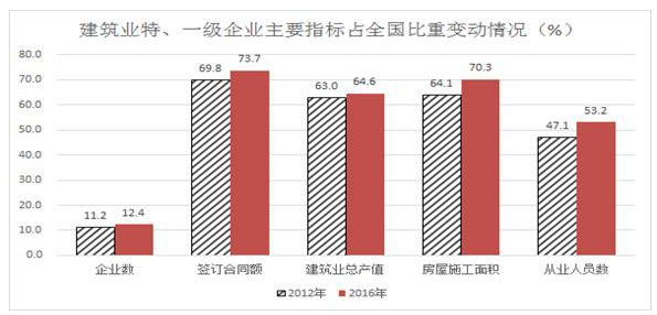 (二)建筑業產業集中度進一步提高。十八大以來,我國建筑行業資質結構漸趨優化,高資質等級企業市場占有率不斷提升,產業集中度進一步提高。2016年,我國特、一級建筑業企業數量較2012年增長21.1%,占全部建筑業企業個數比重為12.4%,比2012年提高了1.2個百分點。特、一級建筑業企業簽訂合同額、完成建筑業總產值、房屋施工面積和從業人員數占全行業的比重分別達到73.7%、64.6%、70.3%和53.2%,比2012年分別提高了3.9、1.6、6.2和6.1個百分點,具有較高資質等級的建筑業企業對全行業的影響力進一步增強。