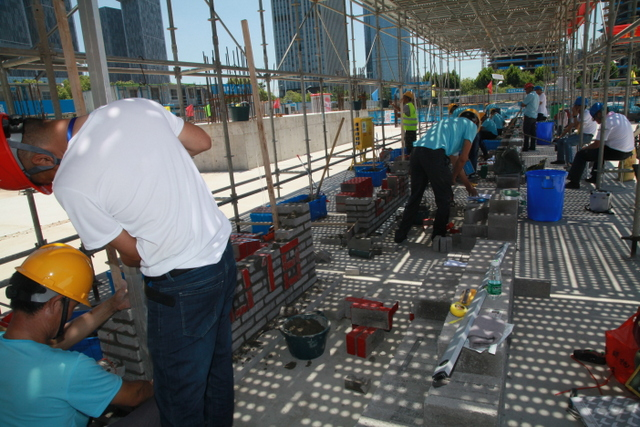 選拔賽分為理論和實操競賽兩個部分,7月12日晚上選手們進行了理論知識考試,13日全天進行了實操競賽。其中,實操競賽試題是根據2018年中國技能大賽砌筑工競賽技術文件要求確定的,采用238*115*50mm灰砂磚,作品墻為120mm厚、長1740mm、高1320mm、兩邊120mm的附墻柱,墻面數字為2018和世博會中國館圖案,數字和中國館凸出墻面10—60mm,中國館的中間留有門洞,灰縫有平縫、凹縫,既體現了世界技能大賽對砌筑特點、規范、標準等要求,又體現出了對建筑工匠實際操作、砌筑質量、砌筑精度和新技術應用等綜合水平的全面考核。競賽中,有不少選手運用了小發明、小創造,用以提升砌筑精度、縮短實操時間,展示了江蘇建筑工人不斷提升自身技能技術、改進施工工藝的水平和能力。
