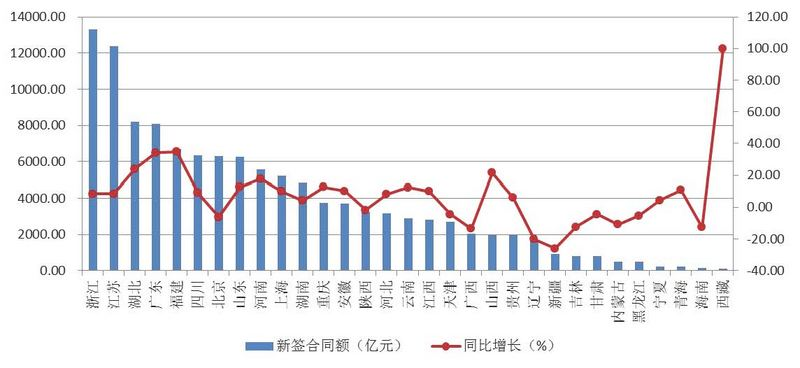 除浙江、江蘇兩省外,總產值超過4000億元的還有湖北、廣東、四川、山東、福建、河南和北京共7個地區,上述9省市完成的建筑業總產值占全國建筑業總產值的63.41%。