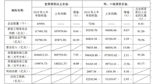 住房和城鄉建設部匯總的7248個特、一級資質建筑業企業2018年上半年主要指標數據如下。