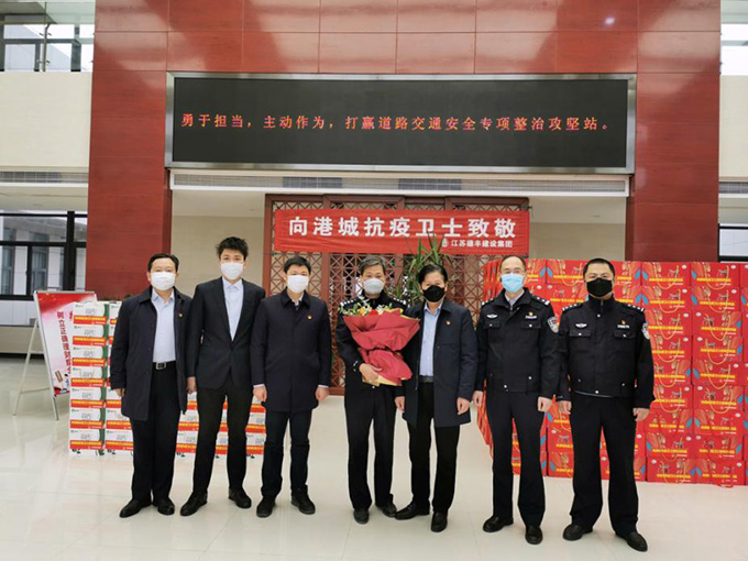 針對嚴峻的防疫形勢,港城交警全員上崗,24小時值守,為港城人民構筑了牢不可破的防疫長城。為向港城衛士表達深深的敬意,2月11日,江蘇德豐建設集團有限公司董事長張云法、總經理陸正其、黨委書記孫樟、產業公司董事長張育誠一行,前往市交警大隊,向港城衛士獻上鮮花和慰問品,感謝他們為港城人民健康安全、社會穩定和經濟發展做出的重要貢獻。