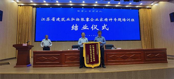 結(jié)業(yè)儀式上,南京華致建設(shè)集團(tuán)董事長葛軍、江蘇邗建集團(tuán)總經(jīng)理賈鳳鳴作為學(xué)員代表作了學(xué)習(xí)交流發(fā)言。張謇企業(yè)家學(xué)院為學(xué)員頒發(fā)了結(jié)業(yè)證書。張寧寧會(huì)長作了總結(jié)講話并向張謇企業(yè)家學(xué)院贈(zèng)送了錦旗,錦旗上書寫“感謝張謇企業(yè)家學(xué)院:弘揚(yáng)張謇企業(yè)家精神 推動(dòng)建筑業(yè)高質(zhì)量發(fā)展”。