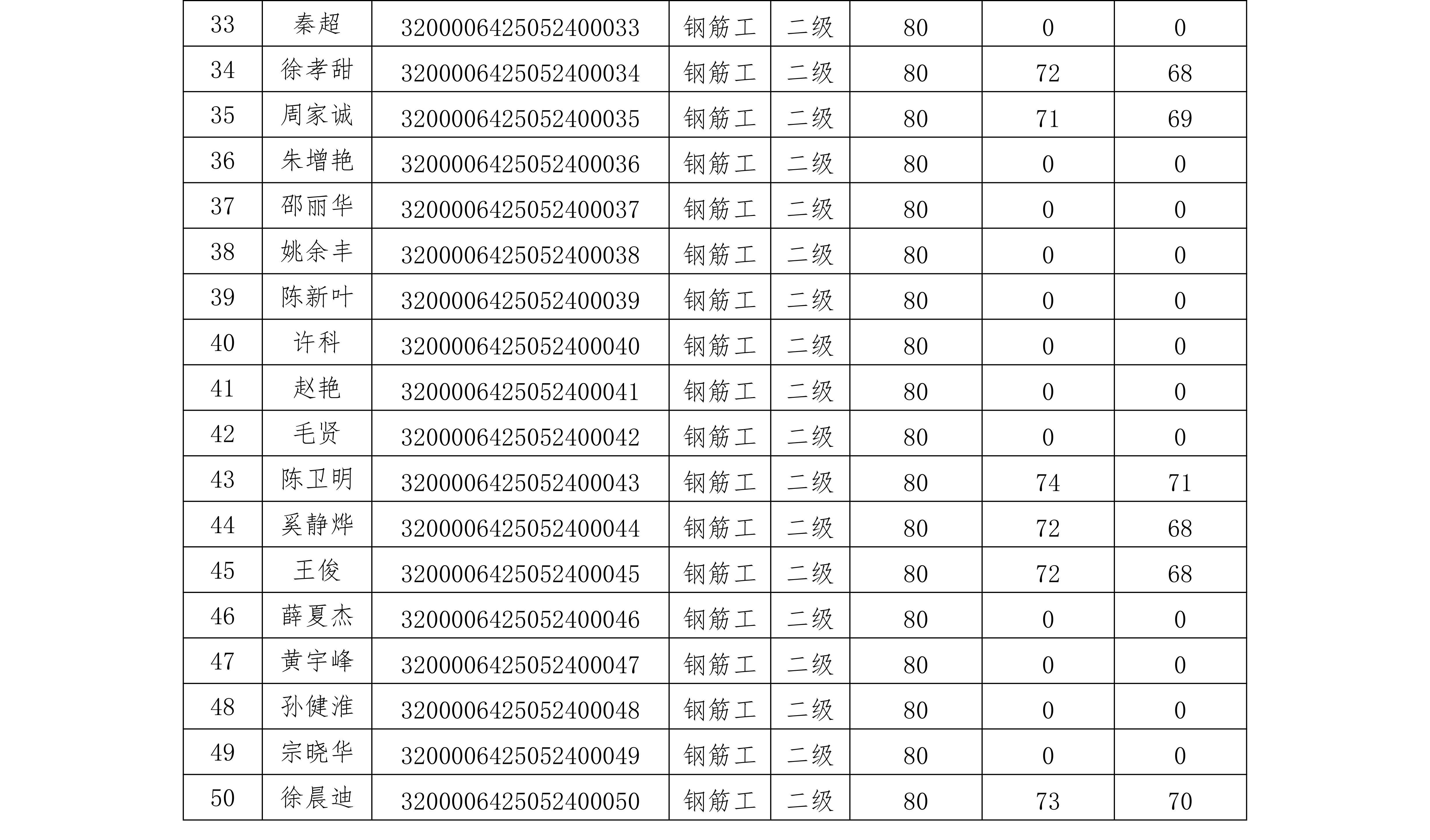 我會于2025年5月24日組織開展了鋼筋工二級職業技能等級認定(認定批次號:2025-32000064-00008),現將考試成績公示如下,公示期5天。