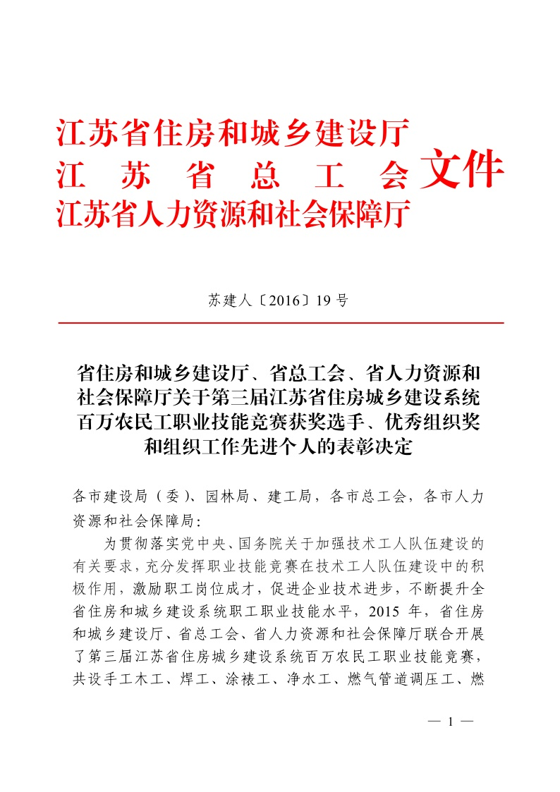 省住房和城鄉(xiāng)建設(shè)廳、省總工會(huì)、省人力資源和社會(huì)保障廳關(guān)于第三屆江蘇省住房和城鄉(xiāng)建設(shè)系統(tǒng)百萬(wàn)農(nóng)民工職業(yè)技能競(jìng)賽獲獎(jiǎng)選手、優(yōu)秀組織獎(jiǎng)和組織工作先進(jìn)個(gè)人的表彰決定