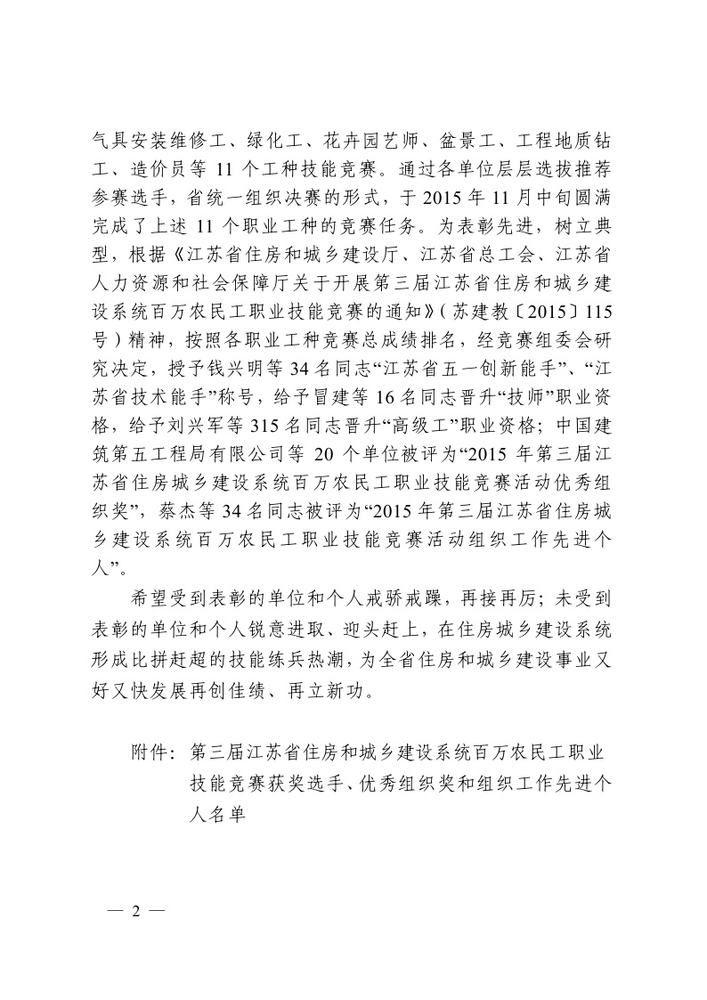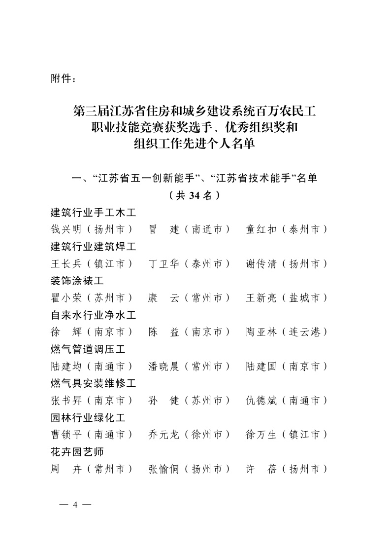 第三屆江蘇省住房和城鄉(xiāng)建設(shè)系統(tǒng)百萬(wàn)農(nóng)民工職業(yè)技能競(jìng)賽獲獎(jiǎng)選手、優(yōu)秀組織獎(jiǎng)和組織工作先進(jìn)個(gè)人的表彰決定