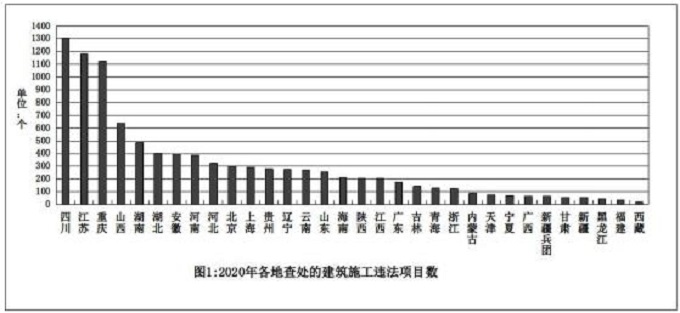從查處的違法違規工程項目總數量看,四川、江蘇、重慶3省(市)查處力度較大,分別查處 1308個、1182個、1125個(詳見圖1)。