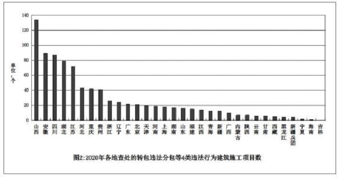 從查處的違法發包、轉包、違法分包和掛靠等4類違法違規行為看,山西、安徽、四川3 省查處項目數量較多,分別查處134個、89個、87個(詳見圖2)。