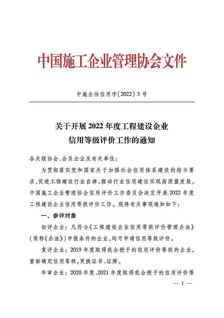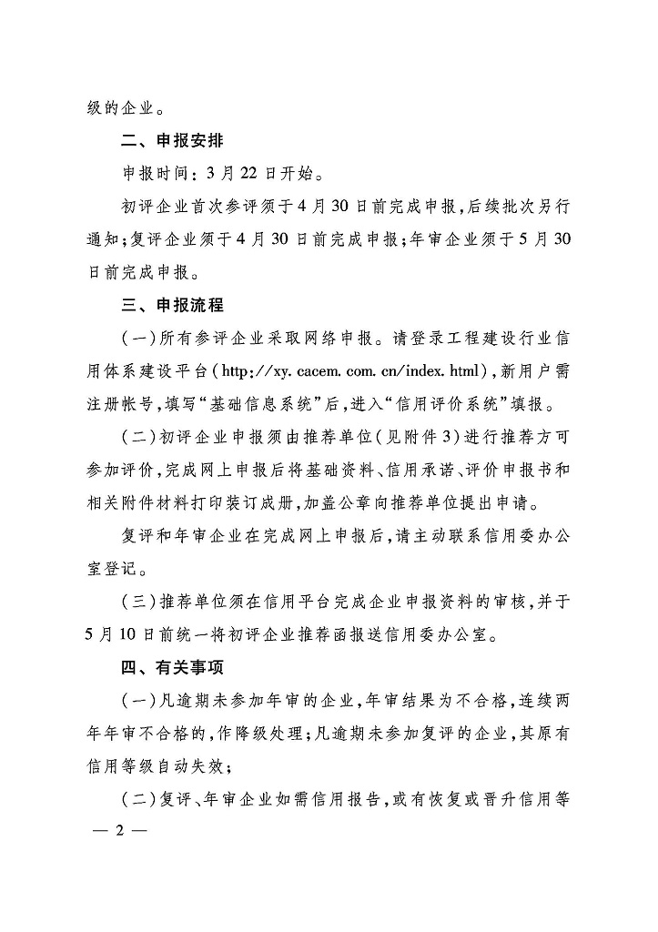 請參加中施企協(xié)信用等級評價的單位按照通知要求進行申報。初評企業(yè)請于5月7日前,將裝訂成冊的申報材料報至我會行業(yè)發(fā)展部,我會將統(tǒng)一推薦。聯(lián)系人:胡宇、田浩,聯(lián)系電話:025-83312695。